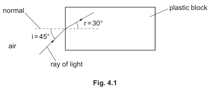 (a) Fig. 4.1 shows a ray of light as it enters the side of a plastic block. The ray of light passes from air into the plastic.
