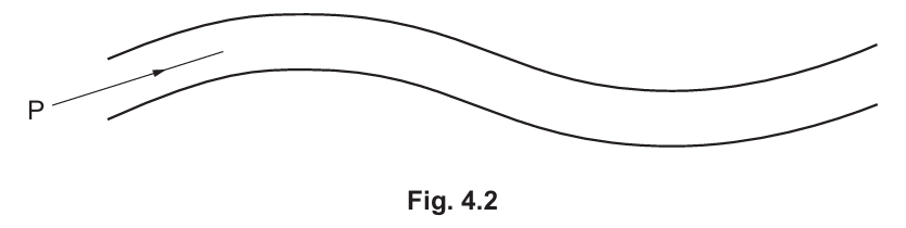 (b) Fig. 4.2 shows the same plastic as in (a) used to make an optical fibre. A ray of light is passing along the fibre.