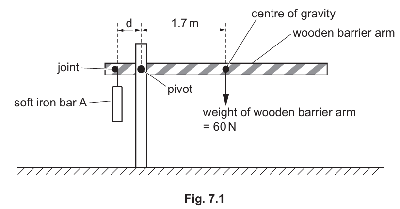 (ii) The wooden barrier arm is in equilibrium. The mass of the soft iron bar A is 23 kg.