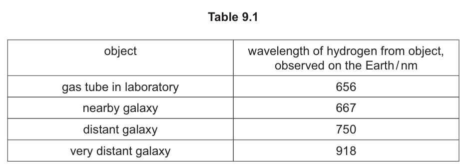 (c) Table 9.1 shows a wavelength of electromagnetic radiation from hydrogen observed in the laboratory and from three galaxies.