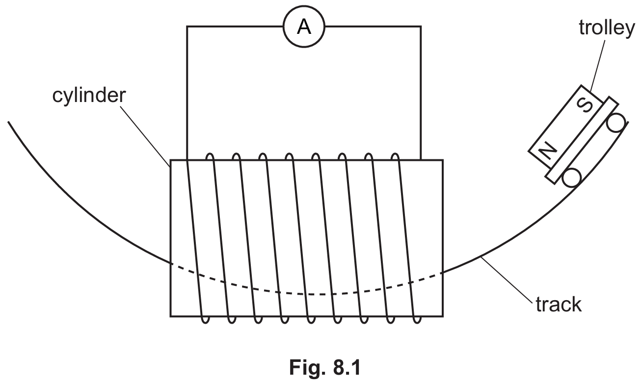 As the trolley moves, mechanical work is converted into other forms. Friction between the trolley and the track dissipates energy as heat. Additionally, according to Lenz’s Law, the induced current in the coil creates its own magnetic field that opposes the motion of the magnet, effectively acting as a braking force that reduces the trolley’s kinetic energy and speed.