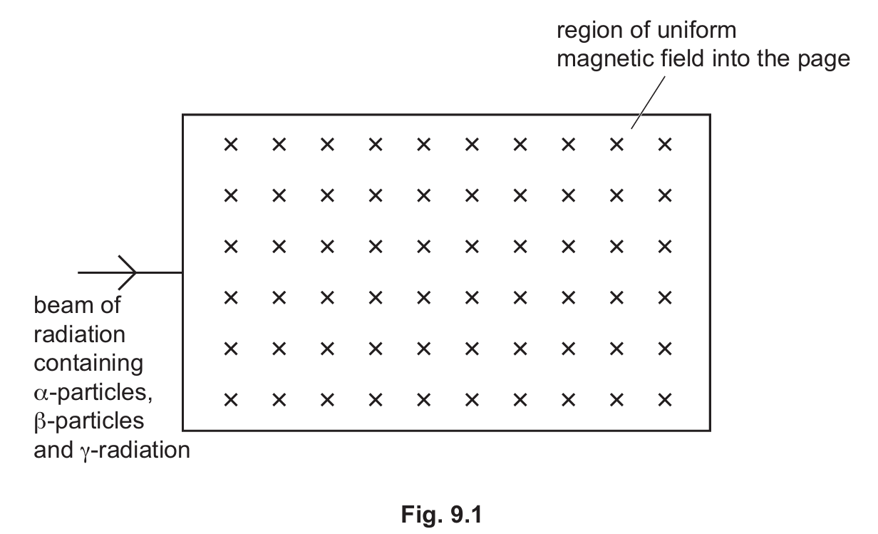 Detailed solution: Using Fleming’s Left-Hand Rule, positively charged $\alpha$-particles experience an upward force. Negatively charged $\beta$-particles experience a downward force; because they have much less mass, their radius of curvature is smaller (a sharper turn) than $\alpha$. $\gamma$-radiation consists of uncharged electromagnetic waves, so it is not deflected by the magnetic field and continues in a straight line.