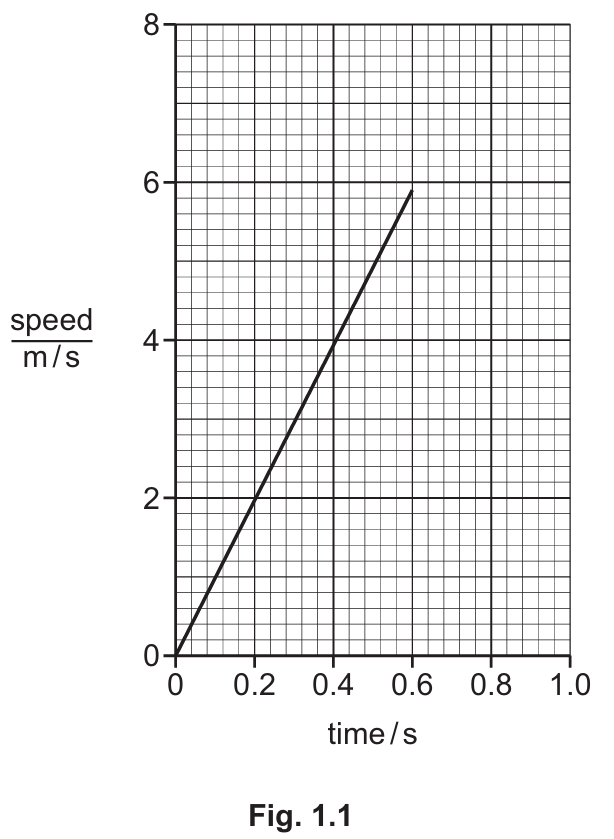 Detailed solution: In Fig. 1.1, the speed-time graph is a straight line passing through the origin, which indicates the ball is moving with constant acceleration. To find the distance, calculate the area under the triangle: $\text{Area} = \frac{1}{2} \times \text{base} \times \text{height}$. Using the graph values at $t = 0.6\text{ s}$ and $v \approx 5.9\text{ m/s}$, the distance is $\frac{1}{2} \times 0.6 \times 5.9 = 1.77\text{ m}$, which rounds to $1.8\text{ m}$.