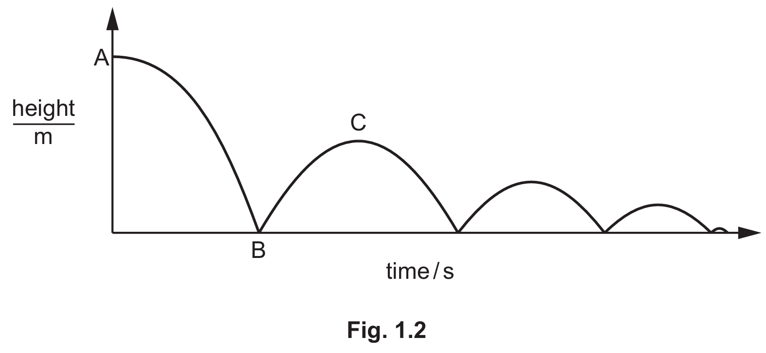 Detailed solution: When the ball hits the ground at point B, some of its kinetic energy is transferred to the surroundings as thermal energy or sound, and some is used to deform the ball (elastic energy). Because energy is “lost” from the ball’s store during the impact, it has less kinetic energy to convert back into gravitational potential energy. Consequently, the ball cannot reach its original height, making height C lower than height A.