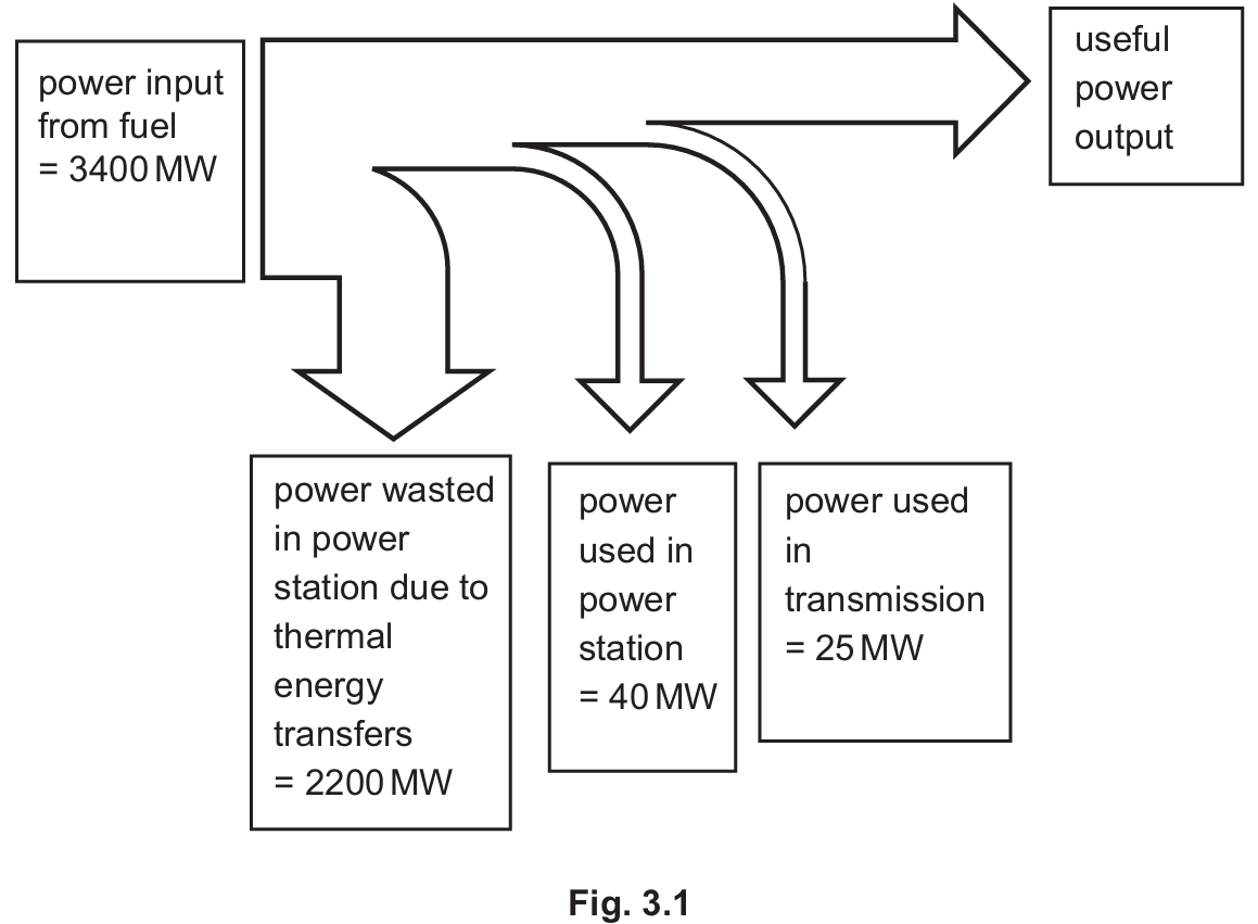 According to the principle of conservation of energy, the total power input must equal the sum of the useful power output and all wasted power. From Fig. 3.1, the total wasted power is $2200\text{ MW} + 40\text{ MW} + 25\text{ MW} = 2265\text{ MW}$. Subtracting this from the total input of $3400\text{ MW}$ gives $\text{useful output} = 3400 – 2265 = 1135\text{ MW}$, which rounds to approximately $1100\text{ MW}$.