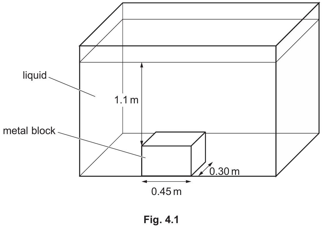First, calculate the liquid pressure at depth $h = 1.1\text{ m}$ using $p = \rho gh = 933 \times 9.8 \times 1.1 \approx 10000\text{ Pa}$. Next, determine the area of the block’s top surface: $A = 0.45\text{ m} \times 0.30\text{ m} = 0.135\text{ m}^2$. Finally, find the force using $F = p \times A$, which gives $10000 \times 0.135 \approx 1350\text{ N}$ to $1400\text{ N}$.