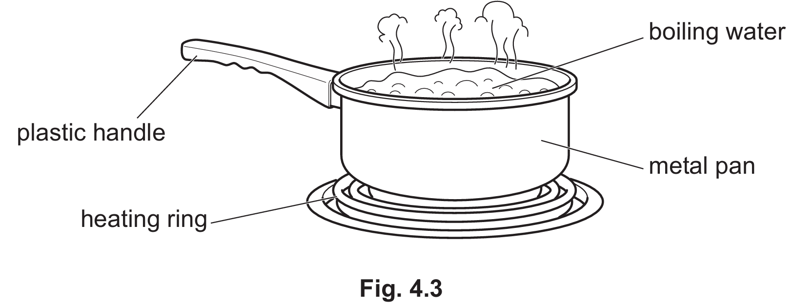 Plastic is a suitable material for the handle because it has a low thermal conductivity. This significantly reduces the rate at which thermal energy is transferred from the hot metal pan to the user’s hand. As a result, the handle remains at a safe temperature to touch even while the water inside the pan is boiling.