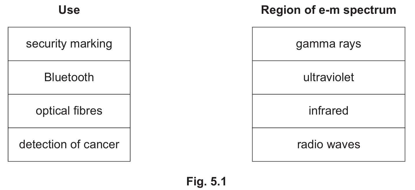 (a) (i) Electromagnetic waves have many uses. On Fig. 5.1 draw one line from each use to the region of the electromagnetic (e-m) spectrum it uses.