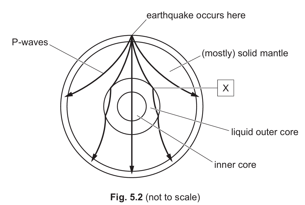 (c) Fig. 5.2 shows a simplified diagram of seismic P-waves travelling through the Earth.