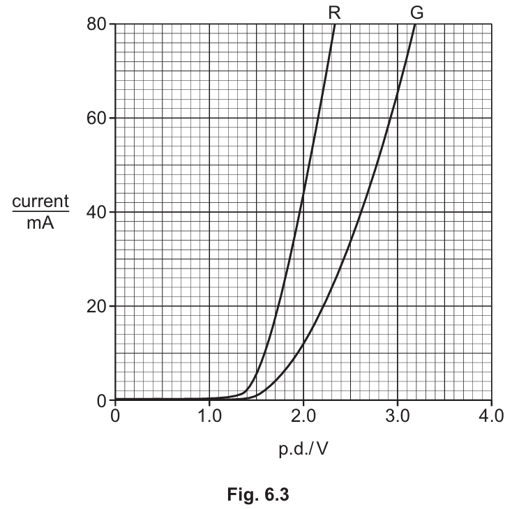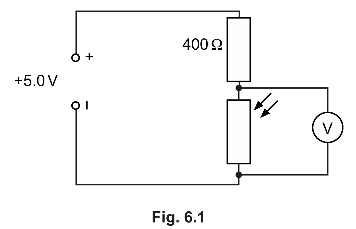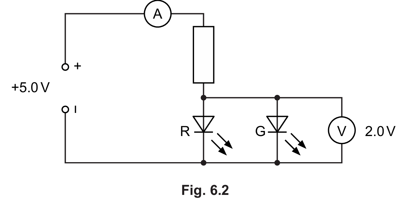 In a series circuit, the supply voltage is shared. The p.d. across the 400 Ω resistor is V=5.0 V−1.8 V=3.2 V. Using Ohm’s Law, I= R V = 400 Ω 3.2 V =0.008 A. This current is the same throughout the series branch.