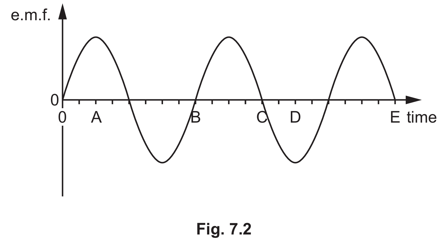 Detailed solution: One complete revolution of the coil corresponds to one full cycle of the $a.c.$ wave on the graph (from zero, through a peak and trough, back to zero). From time $0$ to $B$ is $1$ revolution, and from $B$ to $C$ is another $1$ revolution. Point $E$ occurs after another half-cycle. Counting the waves: $1$ (at $B$) $+ 1$ (at $C$) $+ 0.5$ (at $E$) equals $2.5$ full revolutions.