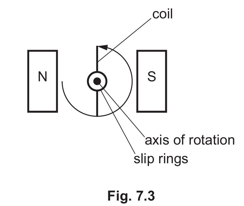 Correct Answer: Rotation of the coil through a magnetic field induces a varying e.m.f. due to the changing magnetic flux linkage.
