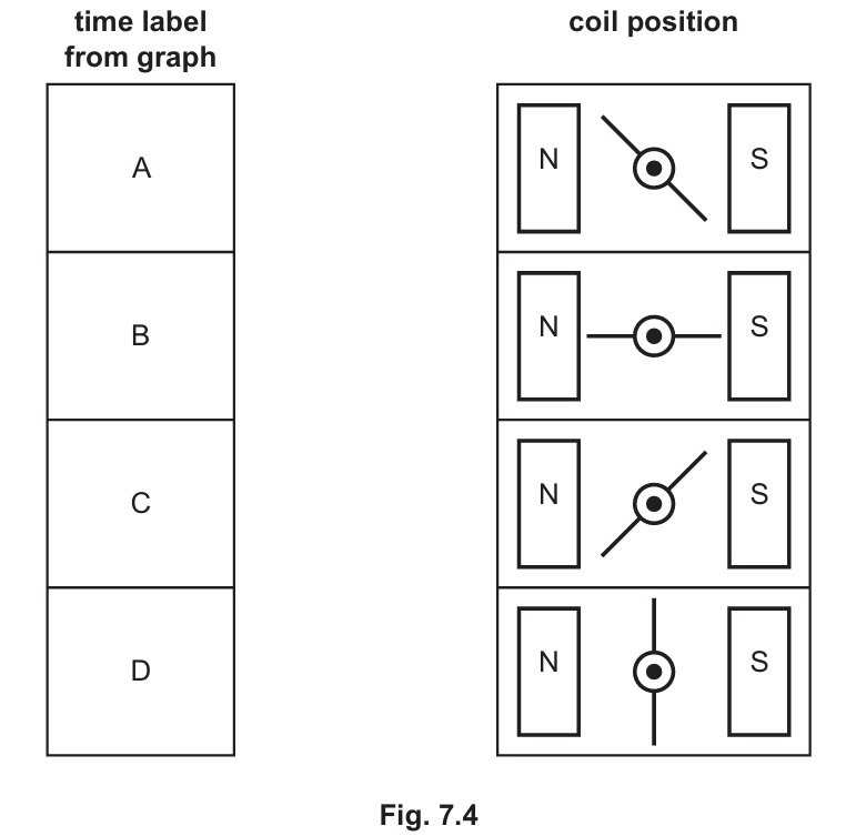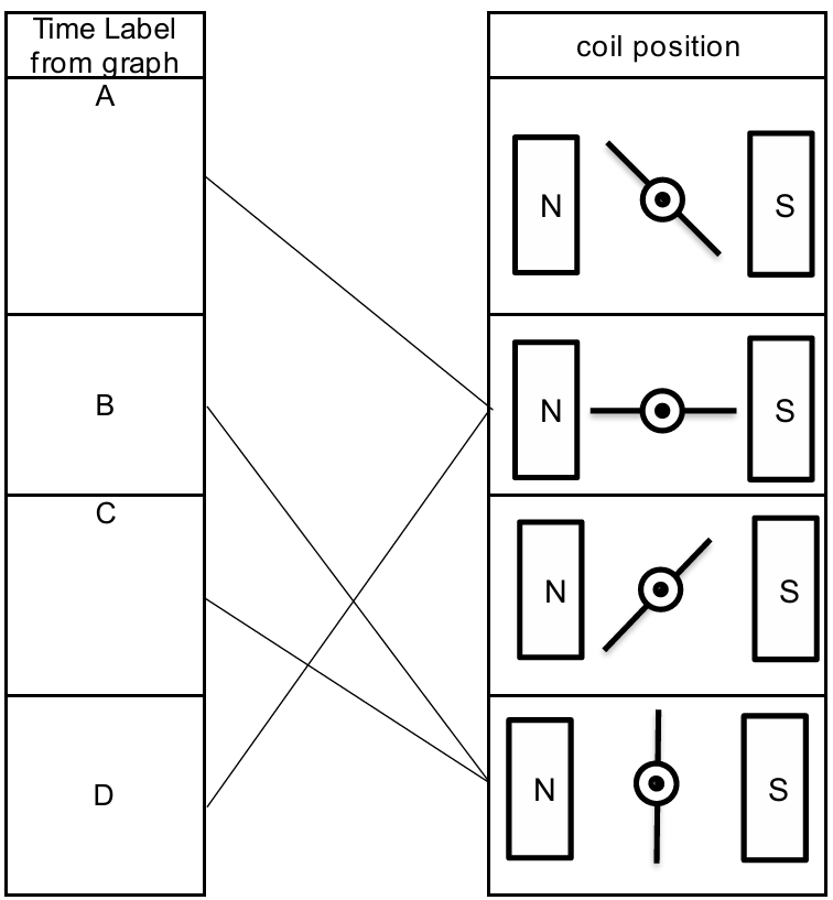 Detailed solution: Induced $e.m.f.$ is maximum when the coil is horizontal because the sides are cutting the magnetic field lines at the fastest rate. Thus, $A$ and $C$ (peaks/troughs) match the horizontal coil diagrams. $e.m.f.$ is zero when the coil is vertical because the sides move parallel to the field lines and do not cut them. Therefore, $B$ and $D$ (zero points) match the vertical coil diagrams.