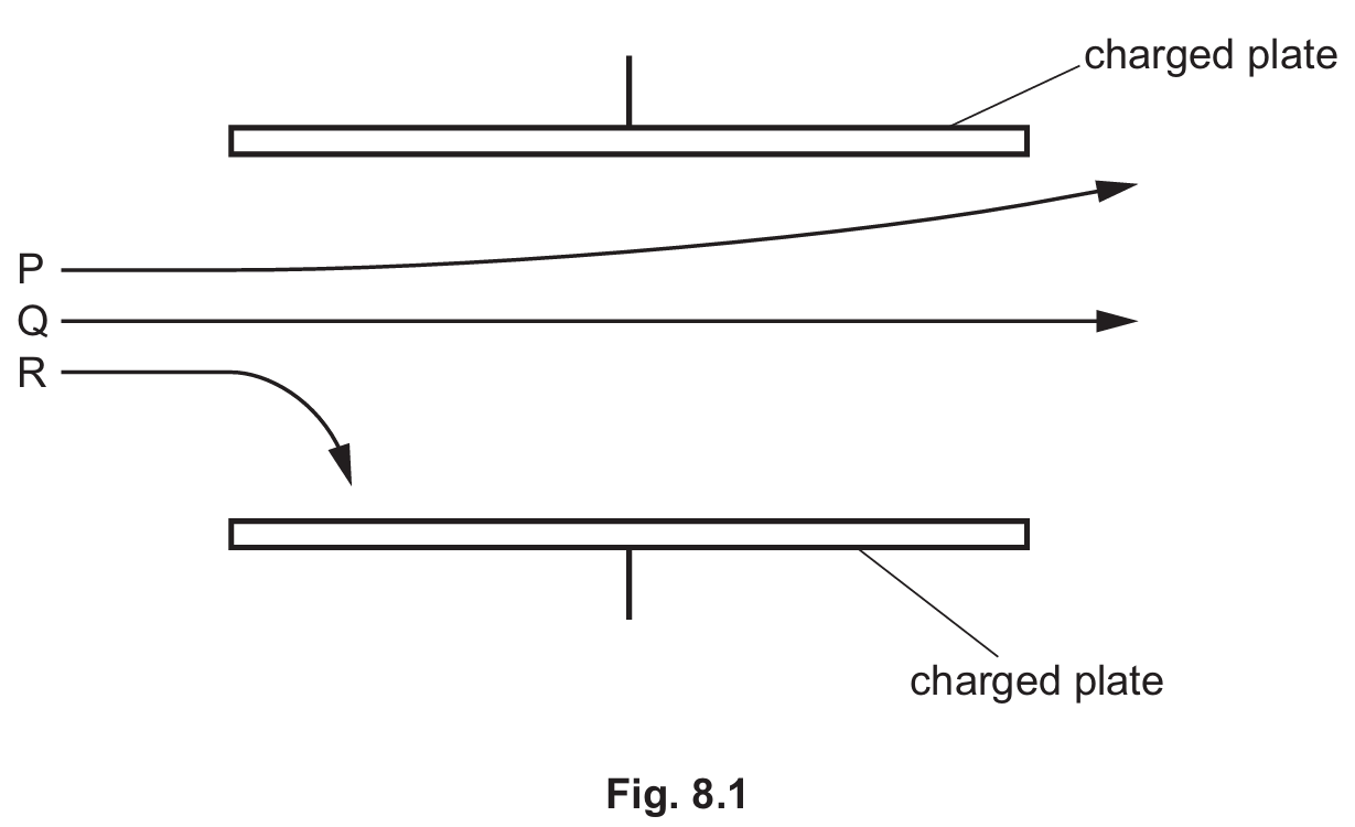 Detailed solution: (i) Path P represents alpha particles because they are much more massive than beta particles (Path R), resulting in a smaller deflection for the same field strength. (ii) The electric field is directed from the positive plate to the negative plate. Alpha particles are positively charged and thus experience a force in the direction of the field, causing them to curve toward the negative (top) plate.