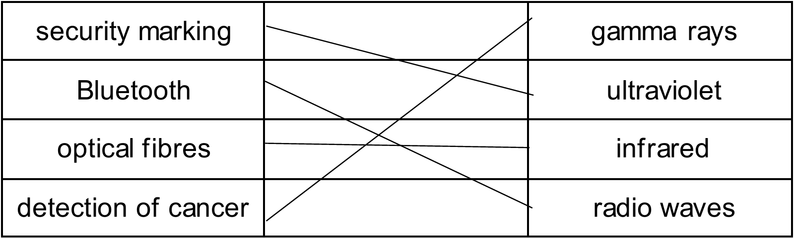 Detailed solution: Ultraviolet light causes certain materials to fluoresce, making it ideal for security marking. Bluetooth technology utilizes short-wavelength radio waves. Infrared is used in optical fibres because glass is transparent to certain infrared wavelengths. High-energy gamma rays are used in medicine to detect and treat cancer. Microwaves are preferred for cell signals because they have higher frequencies than standard radio waves, allowing for a much higher rate of data transmission.