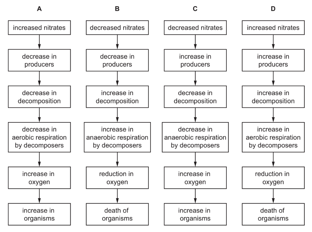 Which flowchart correctly shows the stages of eutrophication?