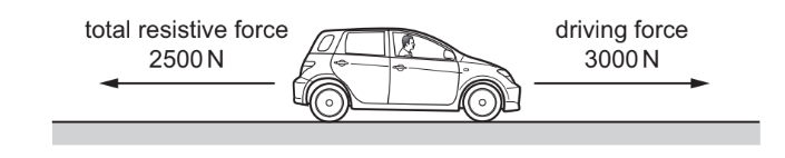 The diagram shows a car of mass 1000 kg travelling along a straight, horizontal road. The driving force from the car’s engine is 3000N. The total resistive force acting on the car is 2500 N.
