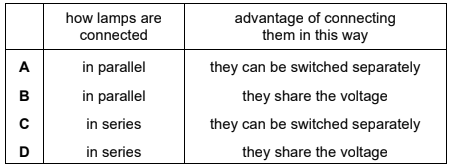 Which row shows how lamps are connected in a lighting circuit in a house and gives an