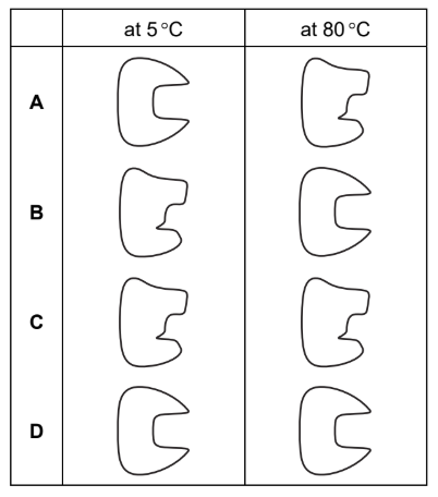 Which row shows the likely shape of this enzyme at 5 °C and 80 °C?