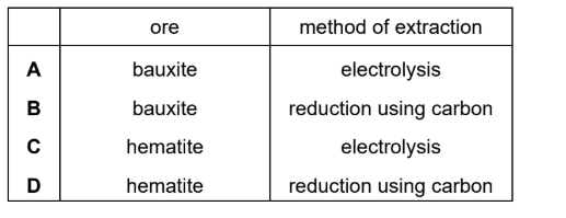 Which row identifies an ore of aluminium and the method of extraction of aluminium from its ore?