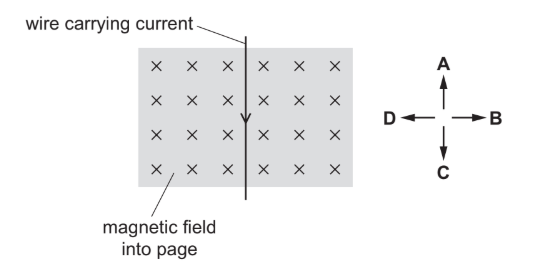 The diagram shows a wire carrying an electric current in the direction shown (towards the bottom of the page). The wire is at right angles to a magnetic field that is directed into the page.