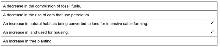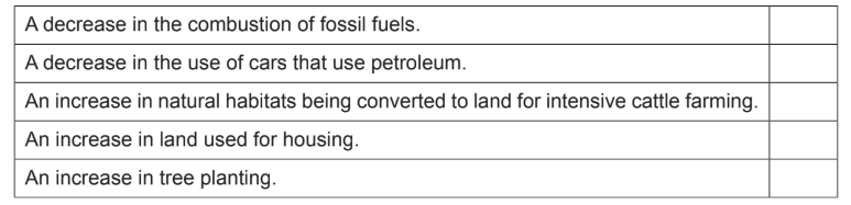 (b) Tick (✓) all the boxes which show factors that cause an increase in carbon dioxide concentration in the atmosphere.