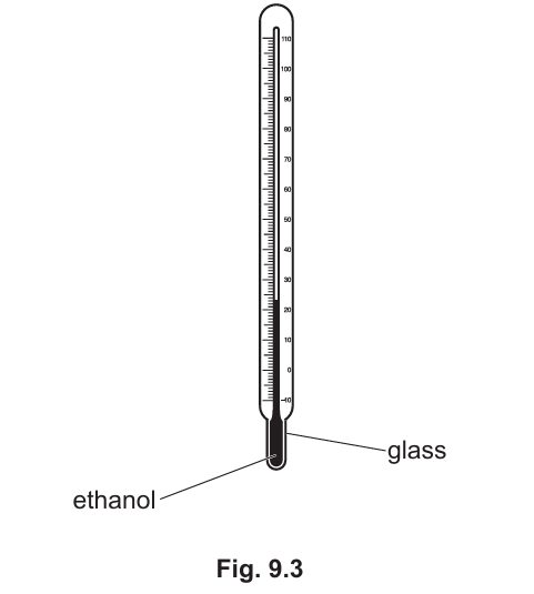 (c) The student uses a liquid-in-glass thermometer to measure temperature. Fig. 9.3 shows the structure of a liquid-in-glass thermometer.