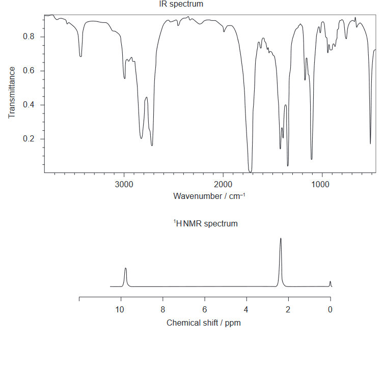 Therefore, based on the evidence from the IR and ${}^1\mathrm{HNMR}$ spectra and the data in Sections 26 and 27 of the data booklet, we can conclude that the product formed is most likely Product B (ethanal).