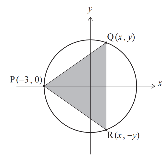 A triangle, PQR, is inscribed in the circle with its vertices at P(-3, 0), Q(x , y) and R(x , -y), where Q and R are variable points in the first and fourth quadrants respectively. This is shown in the following diagram.