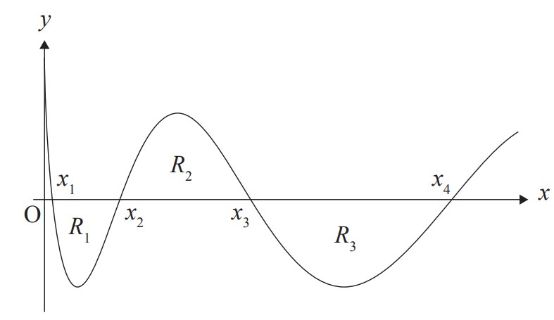 The regions bounded by the curve and the x-axis are denoted by \(R_1 , R_2 , R_3 , …\), as shown