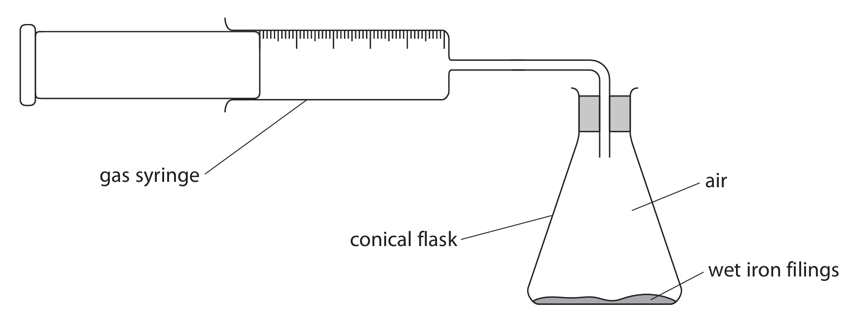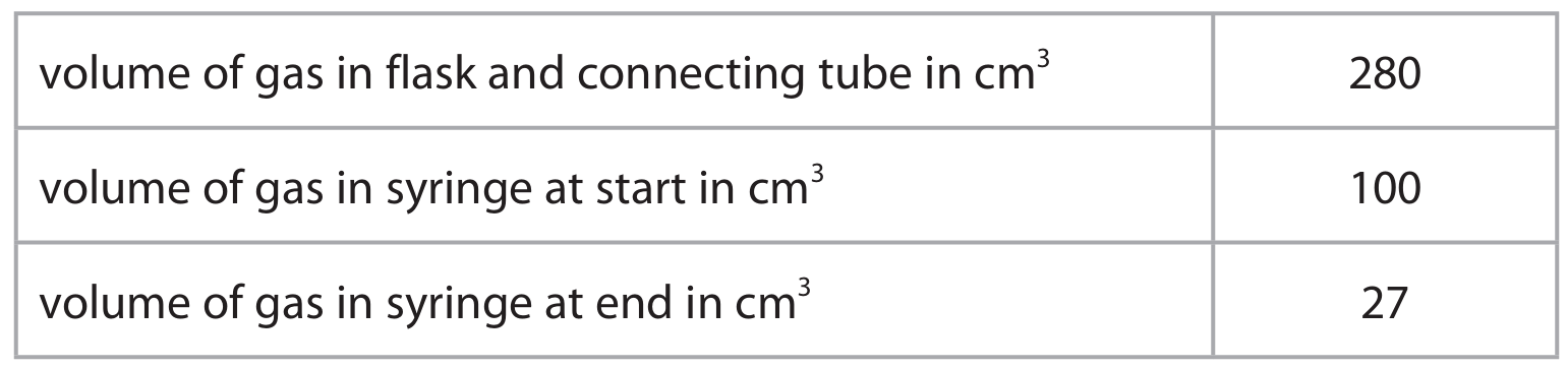 Detailed calculation: The oxygen in the air reacts, causing the gas volume to decrease. The volume of oxygen used is the initial syringe volume minus the final: \(100 – 27 = 73\ \text{cm}^3\). The total initial air volume is the flask volume plus the syringe volume: \(280 + 100 = 380\ \text{cm}^3\). Percentage oxygen = \((73 / 380) \times 100 = 19.2\% \approx 19\%\) (to 2 s.f.).