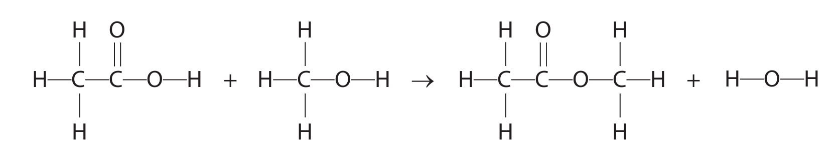 (The C—O in the acid’s —COOH group and the O—H in the alcohol’s —OH group are broken to form the ester linkage and water).