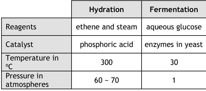 (b)(i) Table completed: Hydration catalyst = phosphoric acid; Fermentation temperature ≈ 30°C; Hydration pressure = 60-70 atm.