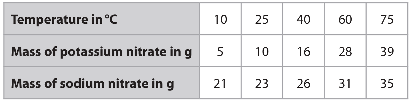 The table shows the maximum mass of potassium nitrate \(\left( \text{KNO}_3 \right)\) and the maximum mass of sodium nitrate \(\left( \text{NaNO}_3 \right)\) that dissolves in \(25\ \text{cm}^3\) of water at different temperatures.