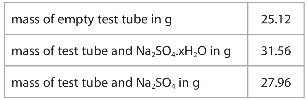Mass of hydrated salt = \(31.56 – 25.12 = 6.44\ \text{g}\)