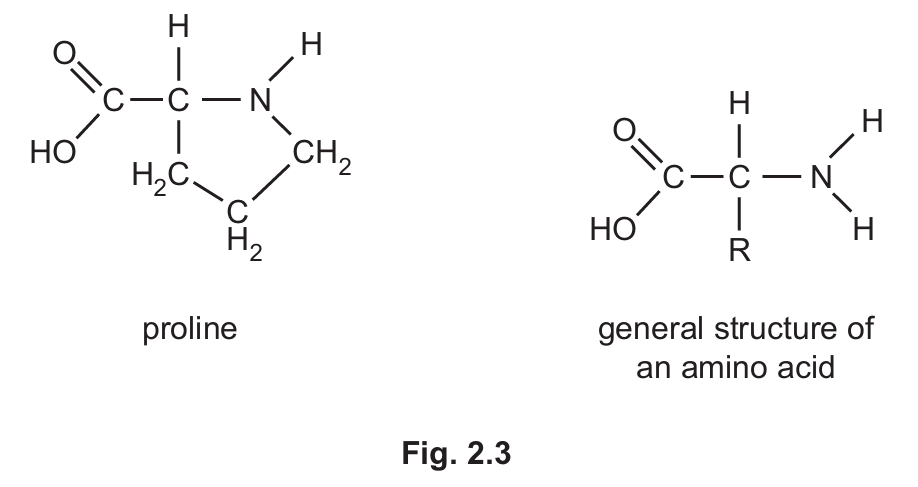 Fig. 2.3 compares the structure of proline (Pro) with the general structure of an amino acid. This shows that proline is an unusual amino acid because it has a cyclic R-group and the nitrogen atom is attached to only one hydrogen atom.