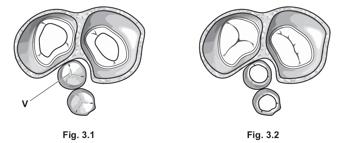 (ii) With reference to the chambers of the heart and the main blood vessels, describe the flow of blood through the heart that occurs when the transverse section of the heart appears as shown in Fig. 3.1.