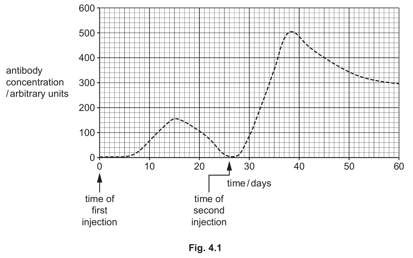 Explain why the concentration of the antibody in the blood was higher after the second injection than after the first injection.