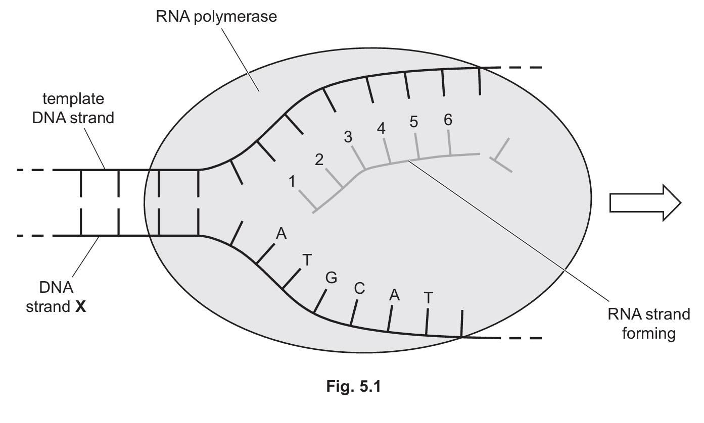 (b) Fig. 5.1 shows transcription of the first six nucleotides of a gene by the enzyme RNA polymerase. The bases of the first six nucleotides on DNA strand X are shown, but the bases on the template DNA strand are not shown.