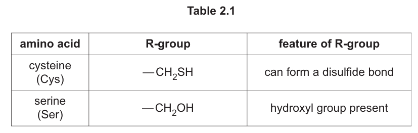Molecules of \(\beta\)-casein have a relatively low proportion of the amino acids cysteine and serine. Table 2.1 shows the R-groups of cysteine and serine.