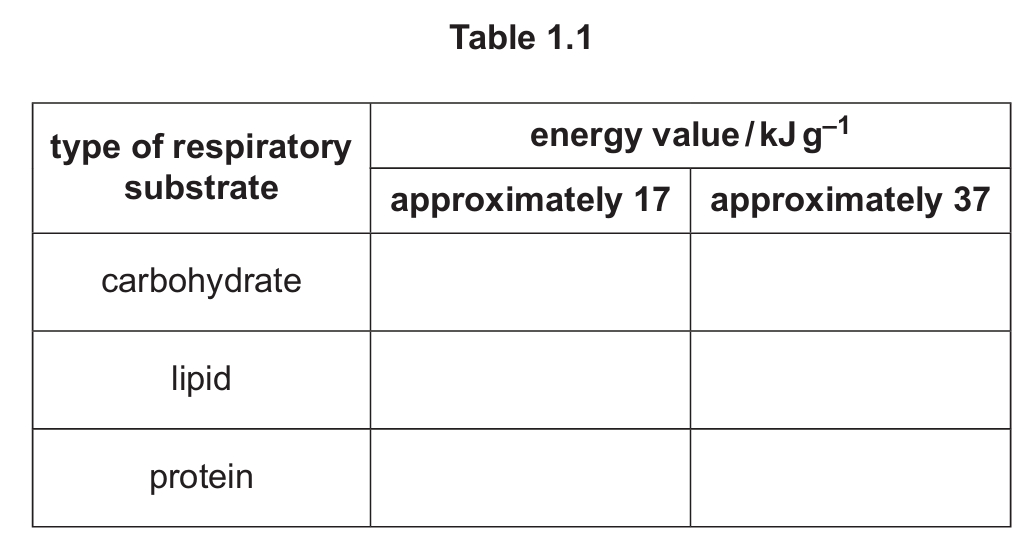 Complete Table 1.1 to show the energy value of each of the three main types of respiratory substrate.
