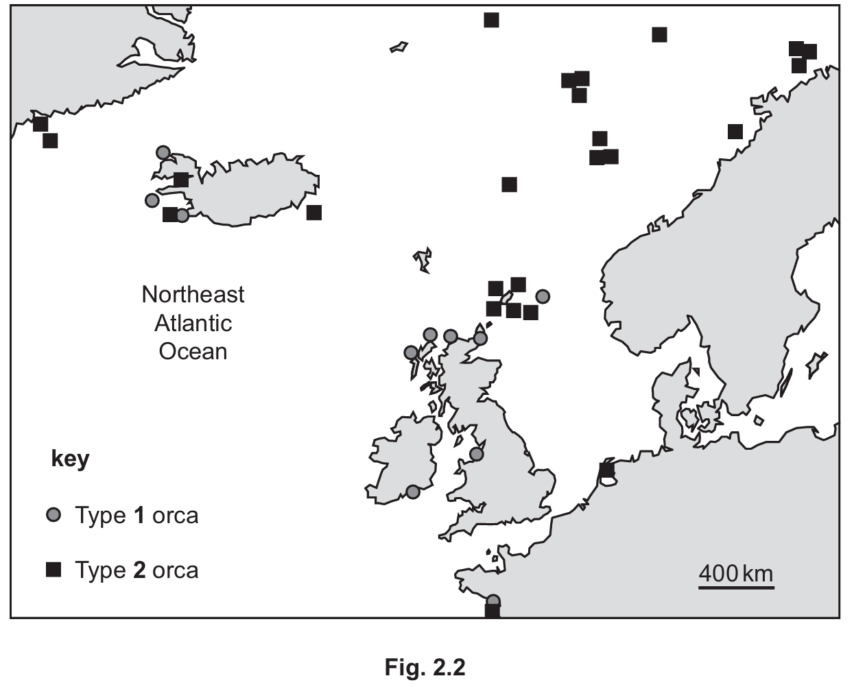 Fig. 2.2 shows the locations in the Northeast Atlantic Ocean where Type 1 orca and Type 2 orca have been observed. Orca do not occur only in these areas and some groups of orca travel great distances.