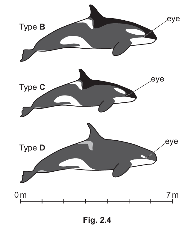 (i) With reference to Fig. 2.4, state one way in which the Type D orca is different from both the Type B orca and the Type C orca.