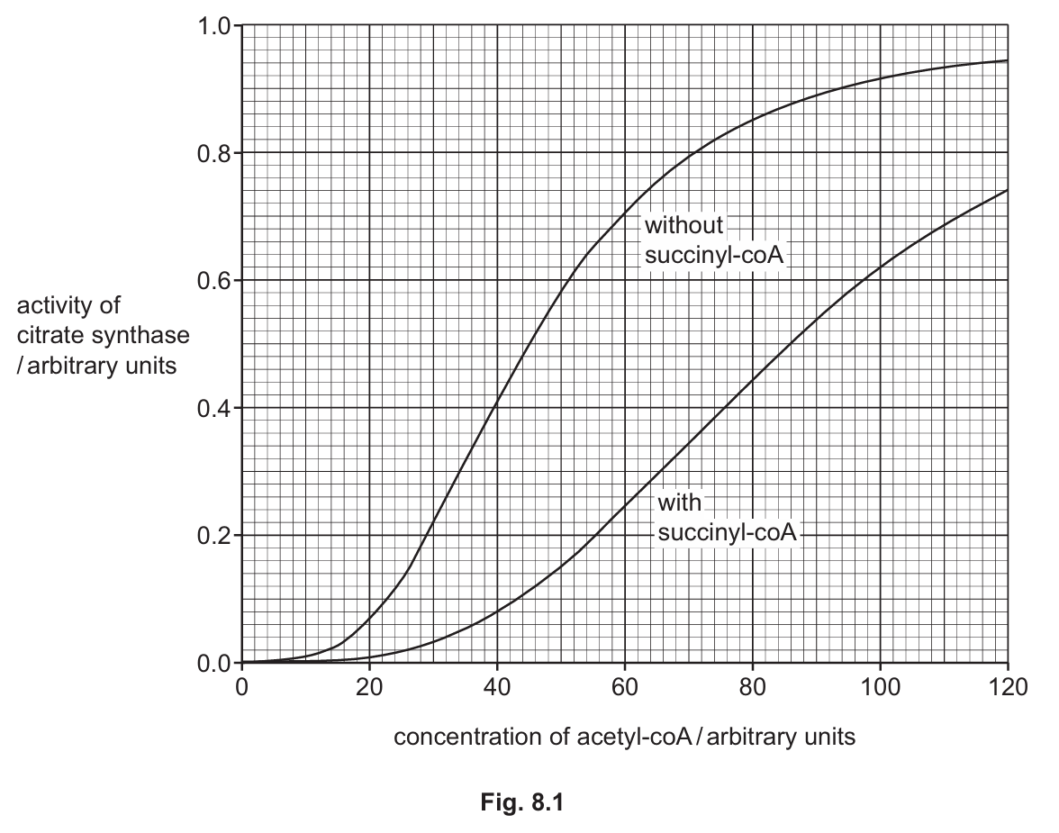 An experiment was carried out to investigate the effect of increasing the concentration of acetyl-coA on the activity of citrate synthase. The experiment was repeated, this time adding a solution of succinyl-coA.