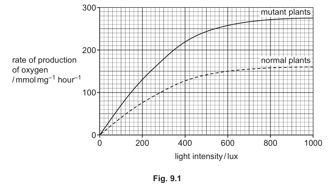 An investigation was carried out to measure the rate of photosynthesis of normal and mutant tobacco plants at increasing light intensities. The rate of production of oxygen was used as a measure of the rate of photosynthesis.
