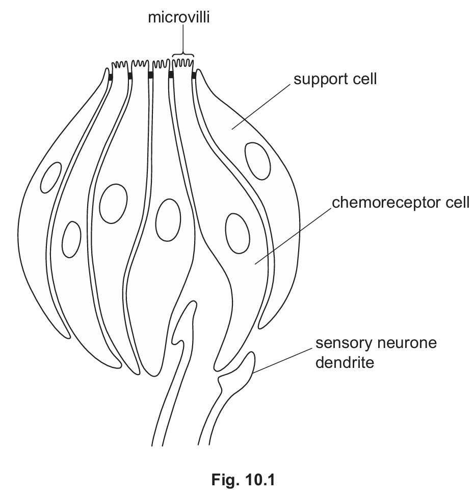 (a) Fig. 10.1 shows chemoreceptor cells in a taste bud. Two of the chemoreceptor cells have formed synapses with sensory neurone dendrites.