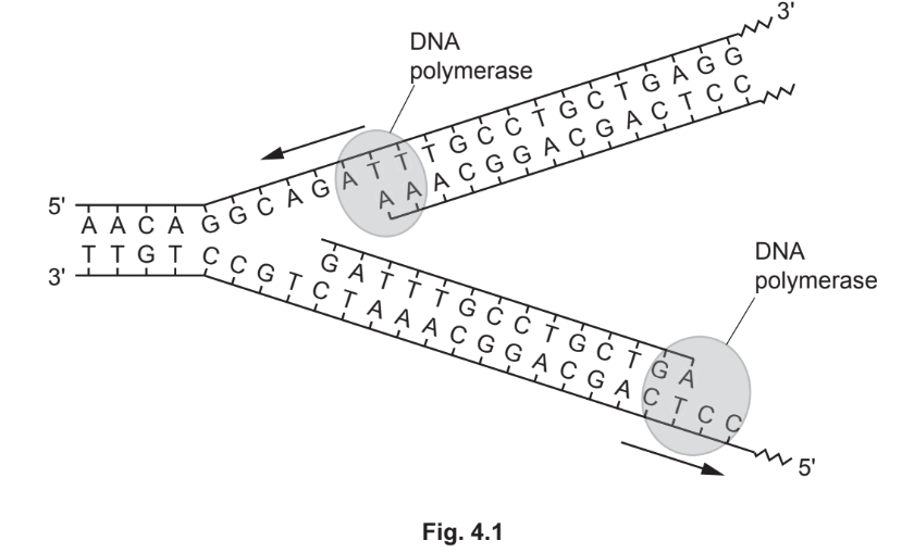 Fig. 4.1 shows the replication of part of human chromosome 11 by DNA polymerase. The arrows show the direction of synthesis of the new polynucleotides by DNA polymerase.