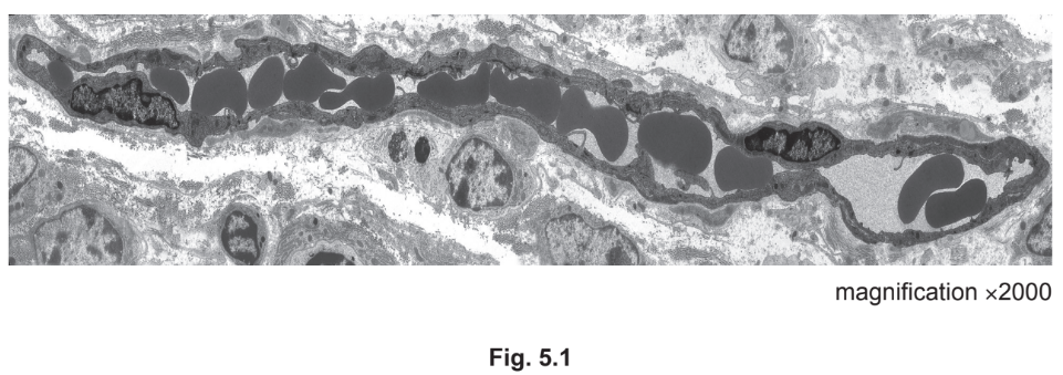 (a) State the evidence, visible in Fig. 5.1, that identifies the cells inside the capillary as red blood cells.