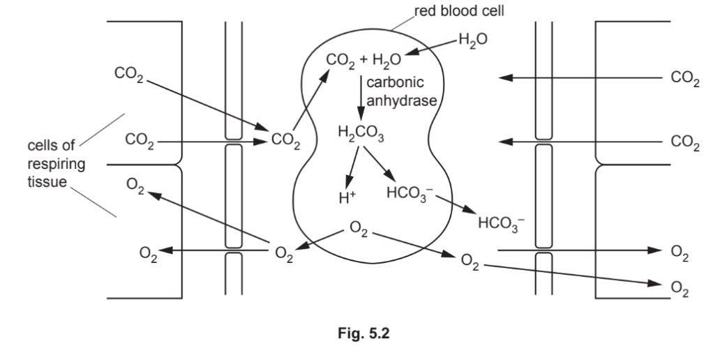 (c) Fig. 5.2 is a diagram showing some of the events that occur as blood flows through a capillary in a respiring tissue.