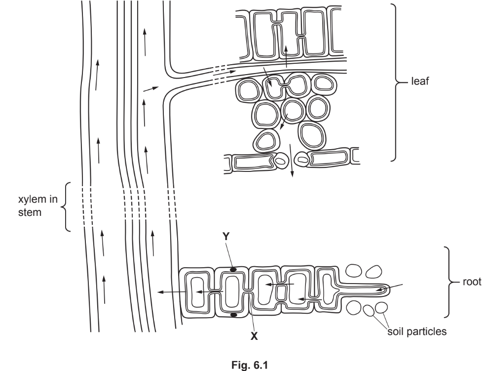 (c) With reference to Fig. 6.1, complete the statements about the movement of water in the flowering plant.